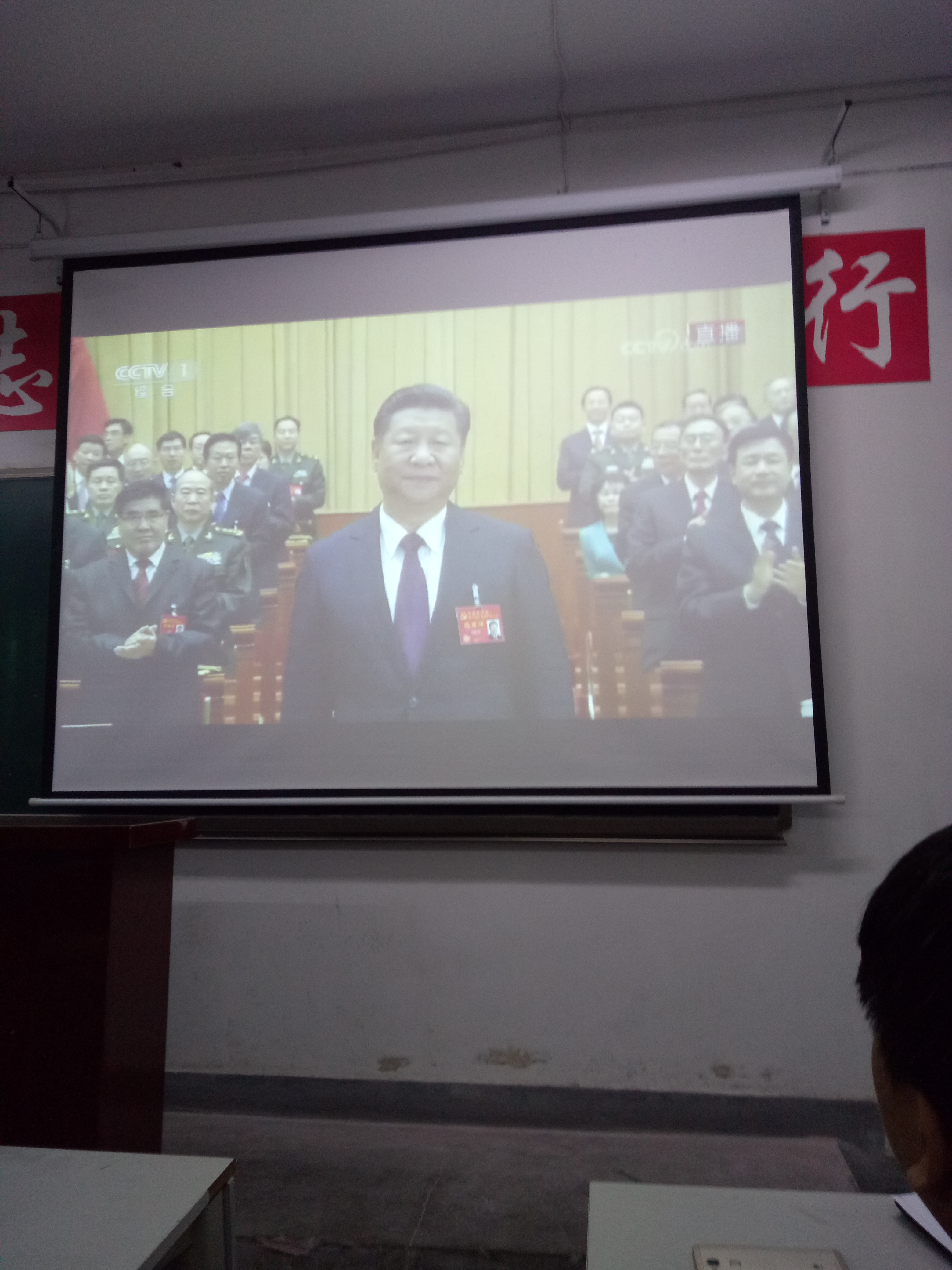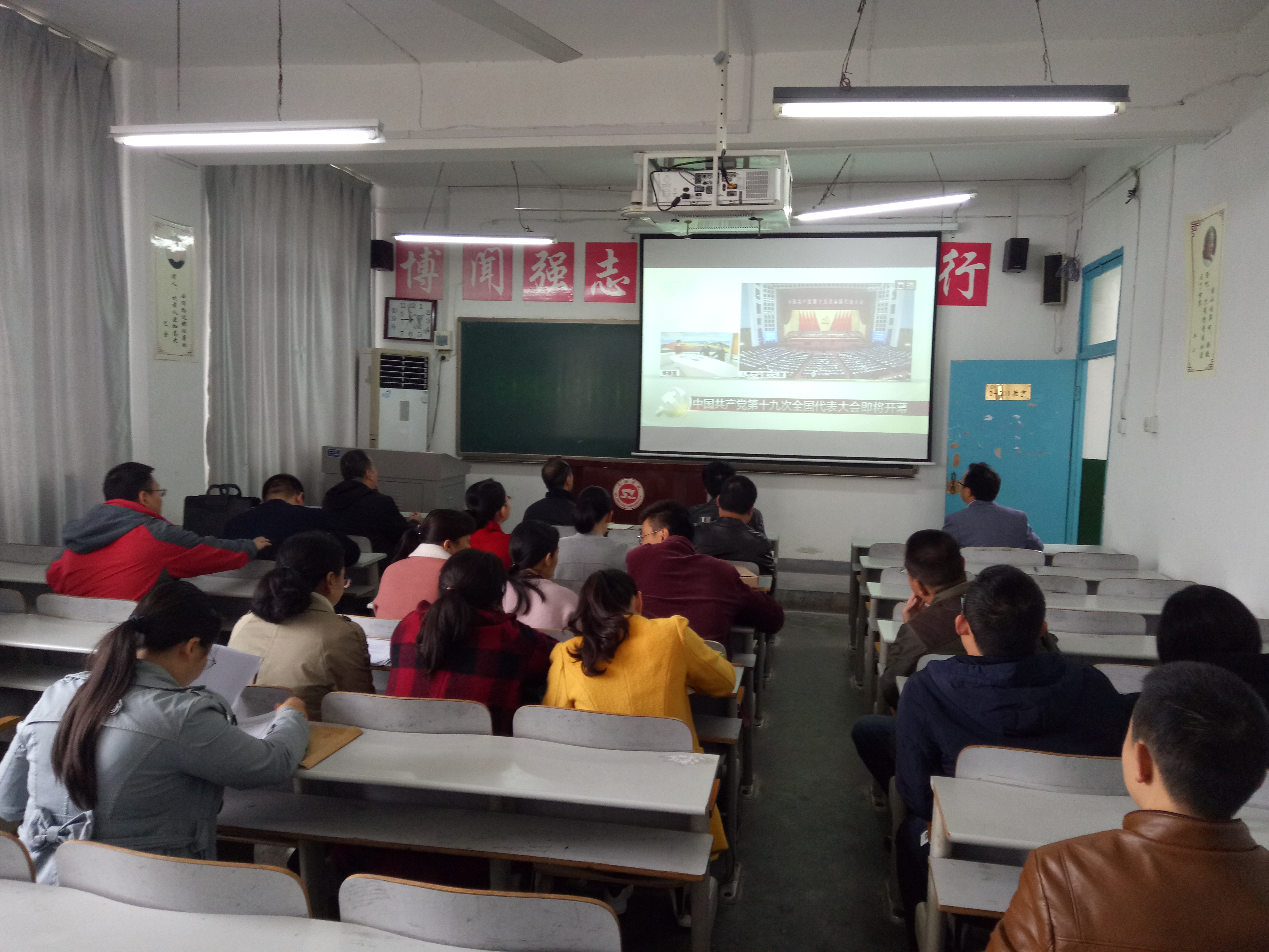 10月18日上午8点50分,2-201教室,电信学院党政领导班子成员及全体没课的党员职工齐聚一堂,聚精会神,收看党的十九大开幕式及习近平总书记的大会报告,深刻聆听并领会报告精神。收看结束,广大党员纷纷表示,要以十九大的胜利召开为契机,深入开展“两学一做”学习教育,从实际做起,努力做好本职工作,为学院和学校事业的发展做出应有的贡献。